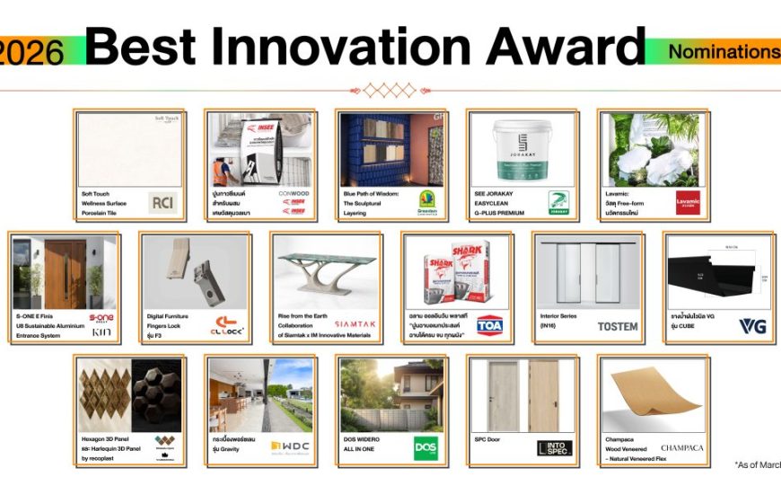 Best Innovation Award 2026 หนึ่งในกิจกรรมไฮไลต์ของงานสถาปนิก’69 เปิดพื้นที่ให้ผู้แสดงสินค้าได้นำเสนอนวัตกรรมผลิตภัณฑ์ก่อสร้างที่เปิดตัวเป็นครั้งแรกภายในงาน สะท้อนศักยภาพของผู้ประกอบการไทยในการพัฒนาเทคโนโลยี วัสดุ และโซลูชันใหม่ เพื่อตอบโจทย์ทั้งการใช้งาน การออกแบบ และความยั่งยืน ในปีนี้มีผู้เข้าร่วมจากหลากหลายแบรนด์ โดยนำเสนอผลงานนวัตกรรมที่โดดเด่น ได้แก่ INSEE / CONWOOD NASTY CERAMIC นวัตกรรมพื้นผิวกระเบื้องพอร์ซเลน “ที่แรกในโลก” ที่ความนุ่มละมุนและอบอุ่น ภายใต้แนวคิด Wellness Living, GREENLAM กับงานออกแบบ The Sculptural Layering ที่ยกระดับ HPL สู่มิติทางสถาปัตยกรรม, INSEE LBM นำเสนอปูนกาวซีเมนต์ที่สามารถนำเศษวัสดุจากไซต์งานกลับมาใช้ใหม่ เพื่อลดของเสียและคาร์บอนฟุตพรินต์ และ JORAKAY...